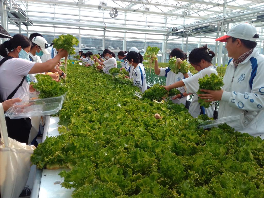 同学们在蔬菜大棚中摘取了运用高科技“水培”的蔬菜。