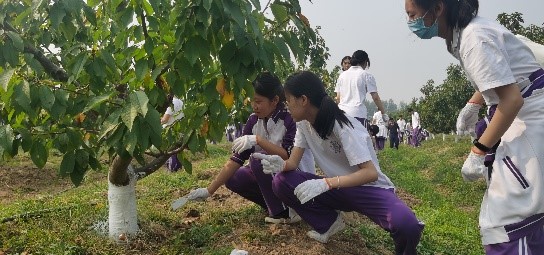 经过午餐的补给和休息,下午的学习之旅也拉开了帷幕,指导教师为同学讲解了果树涂白的必要性,并示范了涂白的技巧。同学们不但了解了果树涂白相关的农业知识,还体验了完整的果树涂白流程,包括调配涂白液、树木定干和涂抹树木,化身果树守护者,亲自挽起袖子,为果树涂白。