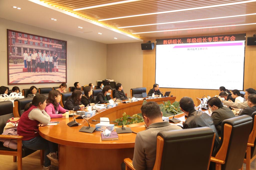 2022年10月21日,bg真人娱乐在成志楼101会议室召开教研组长、年级组长专项工作会,副校长白雪峰、徐文兵,学生发展中心主任李书霞、王田,教学管理与研究中心主任尹粉玉、张苏,年级组长和各学科教研组长30余人参加了会议,会议由教学管理与研究中心主任张苏主持。
