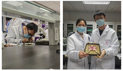 动物实验需要老师们胆大心细。两人一组一只牛蛙,考查老师们对动物解剖工具的正确操作,迅速解剖并辨识、标注主要的内脏器官。本次实验按照动物实验3R(减少、替代、优化)原则进行,首先对牛蛙进行双毁髓,实验过程尽量减轻其承担痛苦及负担。解剖后的牛蛙由生物竞赛学生接盘继续用于练习坐骨神经腓肠肌标本的制备,以达到物尽其用。