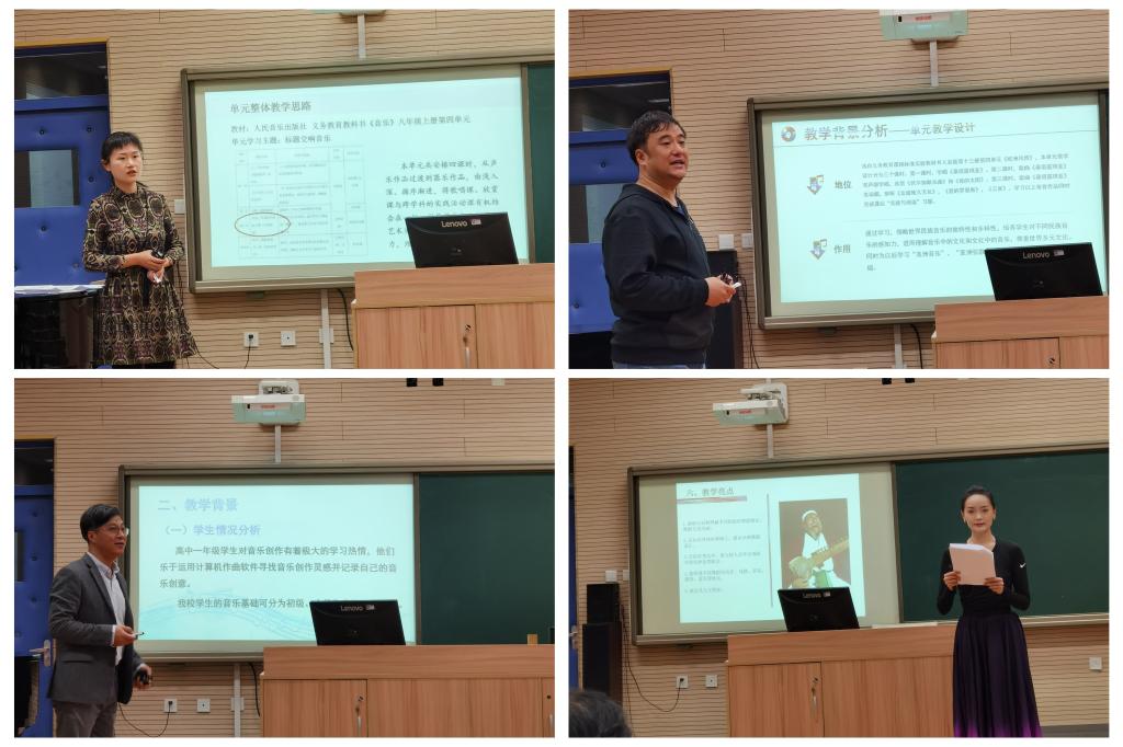 音乐教研组开设现场说课和技能展示两个环节,重点强调教师从以往的单一教案撰写向理论与实践相结合的教学设计转变,从单一课时向单元整体教学设计转变,通过教学研究,不断提高教育教学质量。