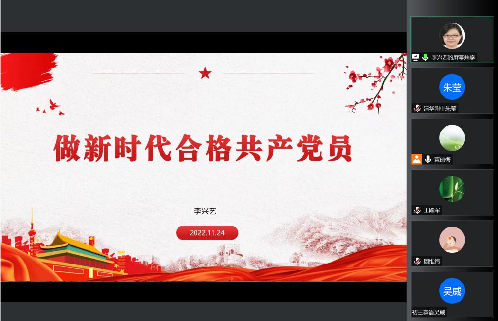 首先,来自初中英语党小组的李兴艺老师做了题为《做新时代合格共产党员》的分享。她认为要做一名合格党员,就要爱国爱党,常怀对党章党规的敬畏之心;要保持与时俱进的精神状态;要全心全意为人民服务。她分享了作为英语教师,自己如何在英语课程中进行德育,并做好每一项教育常规工作;作为班主任,她如何在线上教学期间与学生一起进行体育锻炼。