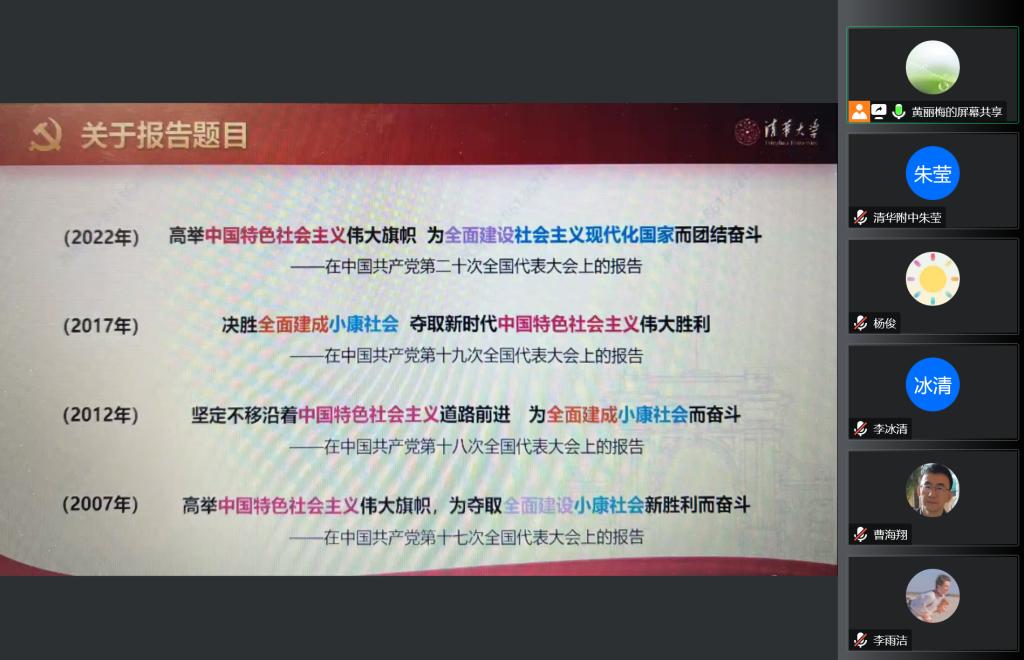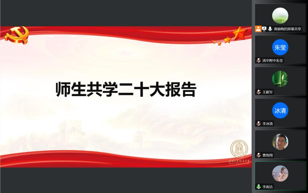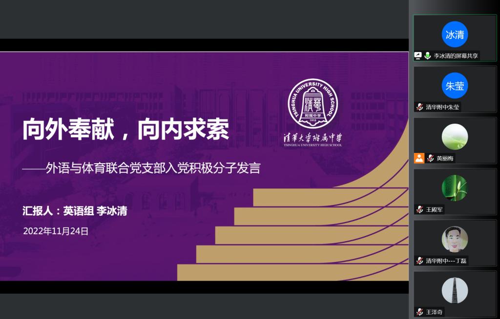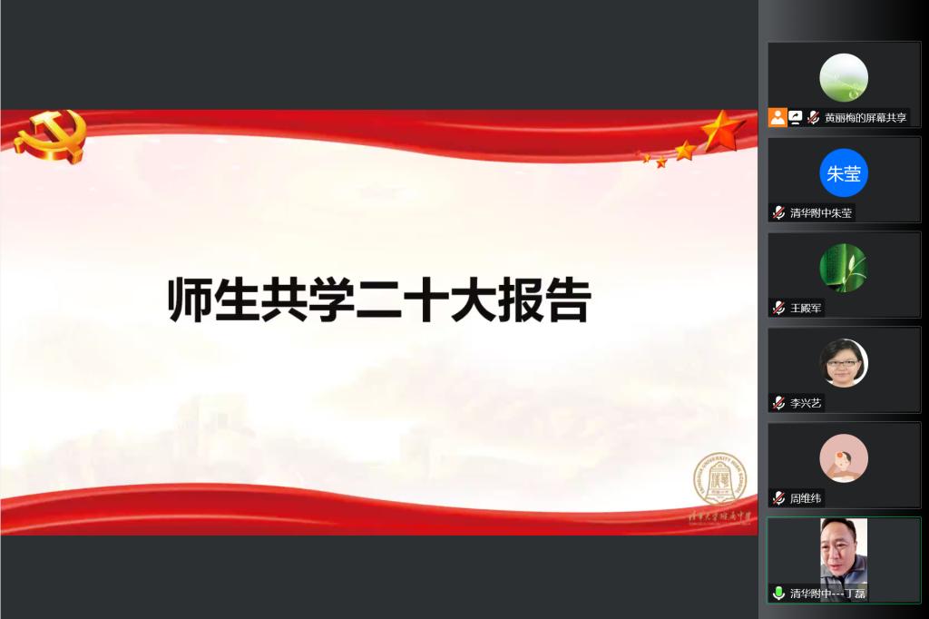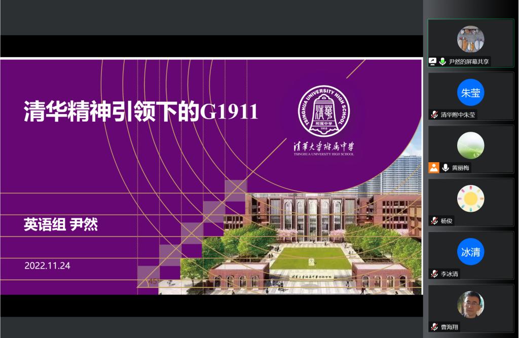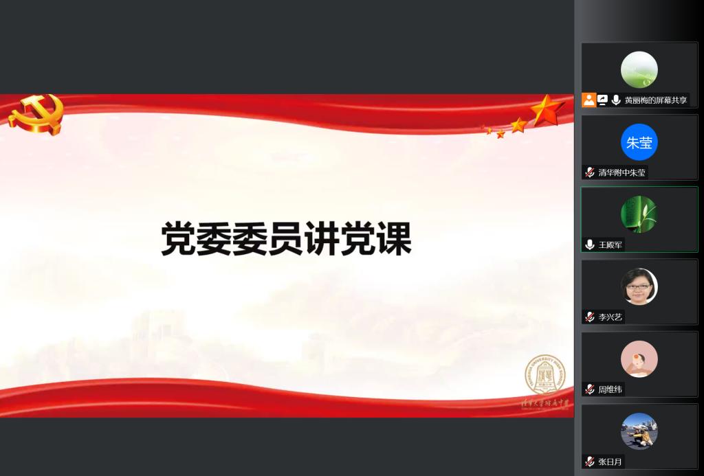最后,高中英语党小组代表尹然老师结合支部课题,向所有与会老师做了题为《清华精神引领下的高1911》的班集体建设经验分享。她讲述了自己如何在高一建班之初巧用班号意义,搭建了高标准的班级目标与实施规划。作为一名党员,尹老师始终将国家发展史、党史和清华历史融入班级的教育工作,将国家发展的大事件和班级每一位同学关联在一起,激发学生的历史使命感和社会责任感。