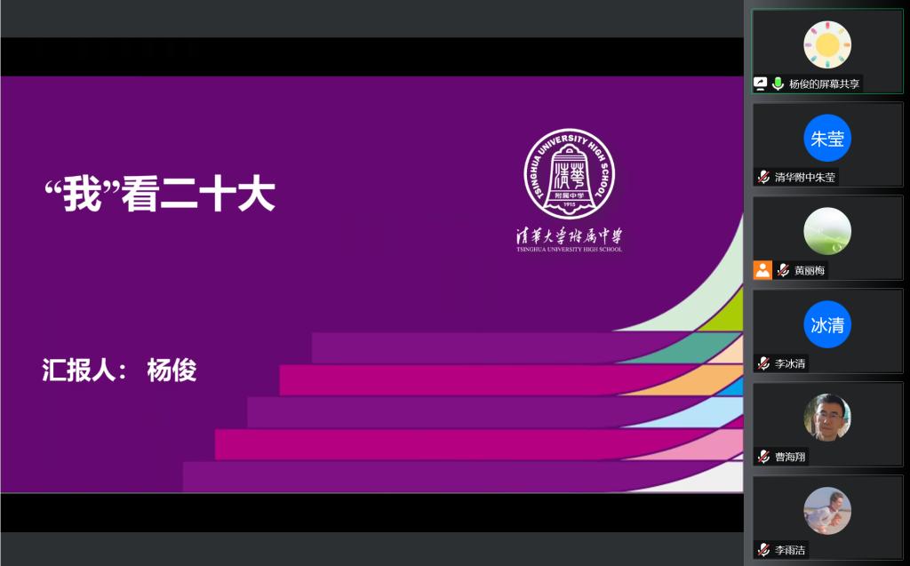 第六位分享的是高中英语党小组代表杨俊老师。杨老师以《“我”看二十大》重点分享了她对王雪莹同学国旗下演讲《回望来时路 奋进新征程》的采访体会。通过她对学生的采访,党员和教师们进一步了解了学生是如何看待党组织、党员、党的二十大精神。学生结合清华精神,使用“初心”“自强”和“实干”三个关键词来解读党的二十大精神给教书育人的我们提出了要与时俱进,提高政治站位的教育要求。