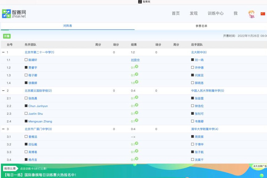 11月14日,北京市棋牌运动协会公布2022年全国国际象棋校园联赛北京赛区线上选拔赛规程。bg真人试玩国际象棋领队赵晨光老师立刻做出回应,结合队员的时间、技术侧重点等情况,最终确定由初2209班周奕宸、初2115班于博华、高2107班张子航和初2203班沈莫千,代表bg真人试玩参赛。在11月26日一上午五轮的激战过后,bg真人试玩综合分数排名第二,挺进全国赛。