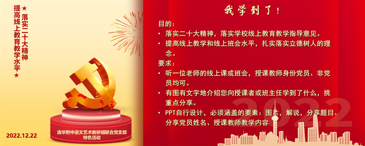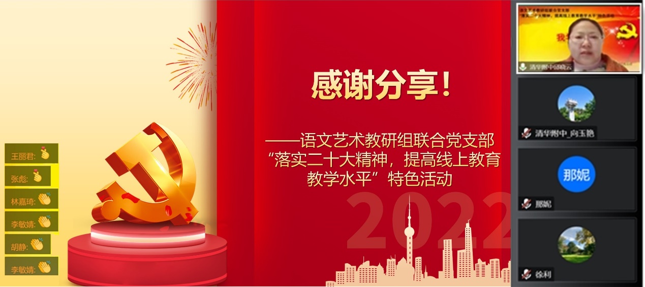 12月22日下午,bg真人试玩语文艺术教研组联合党支部开展“落实党的二十大精神,提高线上教育教学水平”特色活动,以“我学到了”为题,在支部和教研组内开展互相听课、互相学习、互相分享。