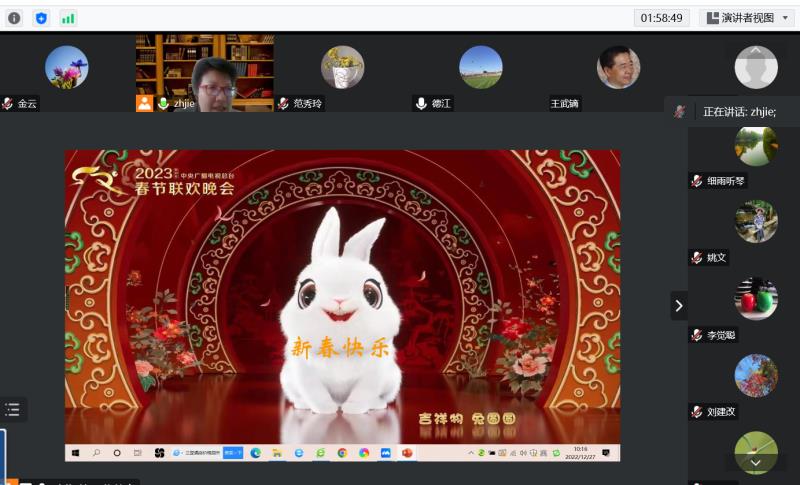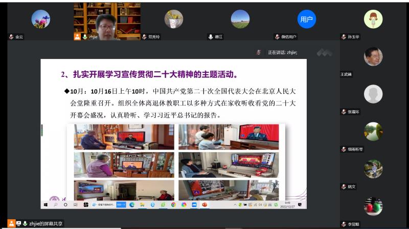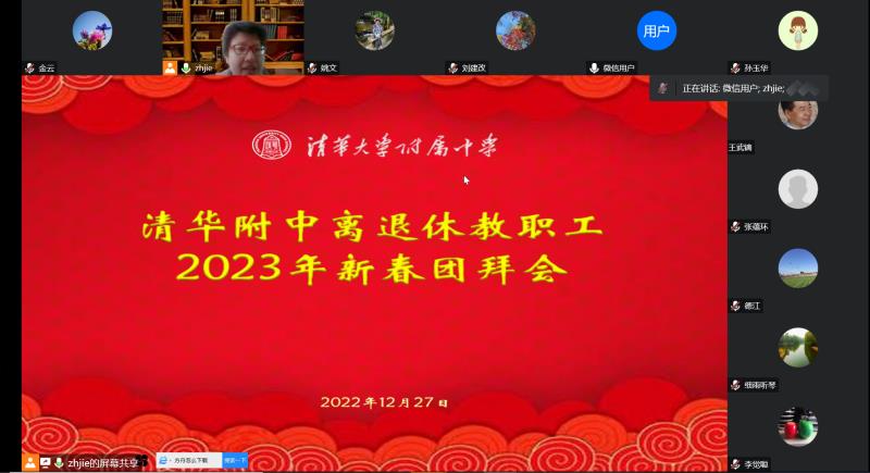 2022年12月27日上午9点,bg真人娱乐举行离退休工作总结及2023年新春团拜会。受疫情影响,今年的团拜会采取线上形式召开。bg真人娱乐党委副书记兼离退休领导小组组长张洁老师主持会议。附中党办校办主任兼离退休领导小组副组长党胜军及小组其他成员、离退休教工党支部书记、各片组组长、兴趣队长共24人参加了会议。