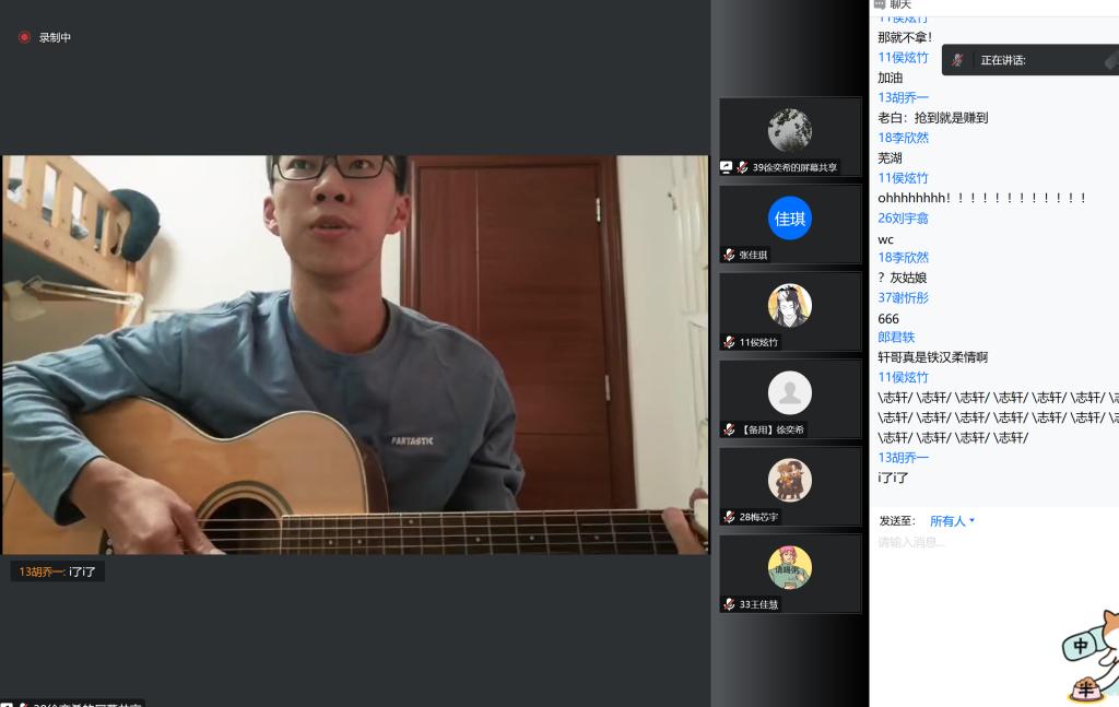 有的班级做了许多前期工作,请同学们总结回顾自己这一年中最难忘的瞬间,将自己的心境起伏与同学们分享。还有班级制作了许多关于班级同学的小竞猜,用ppt展示关于班级同学的冷知识。同学们可以随时开麦克风或者在聊天区留言参与活动,这使得联欢会的气氛充满了温情与欢乐。