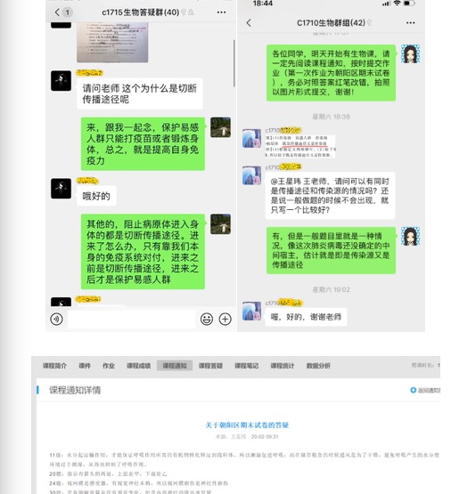 除了在空中学堂的课程答疑区回答学生的问题,我们建立了各班生物答疑群,随时随地回答学生遇到的问题,并且引导学生进行自主讨论,提升学生的学习积极性,保证学生的问题不堆积、不遗忘,能够在答疑中持续进步。最后,会将该部分内容学生疑问较多的地方统一在课程通知中公示,保证全体学生都能明确重点问题,查缺补漏。