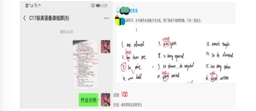 学生做完试题后,根据已经提前发送的答案,自己完成试题批改,疑难问题再通过观看讲解视频进行订正,并拍照上传。老师查看学生上传的已经批改订正后的答题图片,通过评语及时给学生反馈,对表现好的多鼓励,表扬好的做法,对于不太好的,提出问题所在,鼓励积极改正。