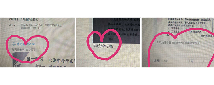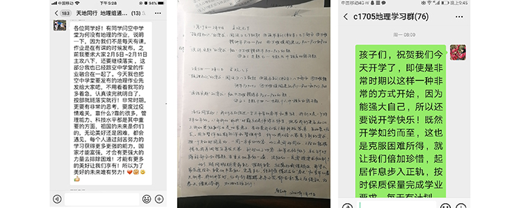 在这期间,地理组涌现了很多感人的事迹:刘景奎老师与姚佳老师微信开展集体备课每次时长超过一个小时,常常备课到凌晨3点,为力保及时解答学生的困惑,凌晨微信答疑都是常见的;张伟老师和王宝琴老师随时随地线上为学生答疑,每一条语音都寄托了老师对学生的殷切期望,张伟老师说到:“答疑的过程真的是教学相长,与学生讨论的问题,有的饶有趣味,有的细致入微,有的是高频题点,虽不能见面,但是能感觉到他们很努力、自律,这一代人,出生于非典,备考于肺炎,但是,只有与国家共患难,才能真正使养尊处优的少年成长为有责任担当的国家栋梁!”;谷丰老师和王宝琴老师身在国外,克服时差困难,高效高质做好教研和答疑工作;高昕老师和唐秀梅老师1月26日便开始着手准备录课,期间线上答疑,课程讲解不间断,常常工作到深夜,唐秀梅老师为学生手写了信件,鼓励学生在初三这样一个重要的时期,自觉学习,完善自我,争取更好的成绩,同时唐秀梅老师还收到很多学生们的反馈,“老师辛苦了!”“老师注意休息!”“老师您练练颈椎”学生们的进步和温暖话语是我们前进的最大动力;伊娜老师面对初二新中考形势,重新构建知识框架,带领初二备课组一周至少进行两次30分钟以上的集体备课,精心准备微课和练习题,力求在线上教学中带领学生逐一攻破知识难点;李慧蕾老师、施晴老师、赵习老师、周小康老师在视频微课中也收到了来自学生弹幕的鼓励与喜爱。