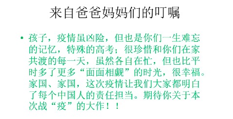 亲爱的bg真人娱乐的同学们,大家好!己亥庚子之交,湖北武汉遭遇了一场空前严峻的新冠肺炎疫情,导致武汉封城,湖北封省,举国防疫,世人揪心,真是“疫发不可收拾”。对于我们的国家来说,正处于一场灾难之中。有人说,这届高三学生生于非典,考于新冠,自招改革,开学延期,对各位同学来说,今年真的是“太南了”!大家一边紧张备战高考,一边密切关注疫情,压力之大,可想而知。此时此刻,作为一名湖北籍的学生家长,我有很多心里话想跟大家说一说。