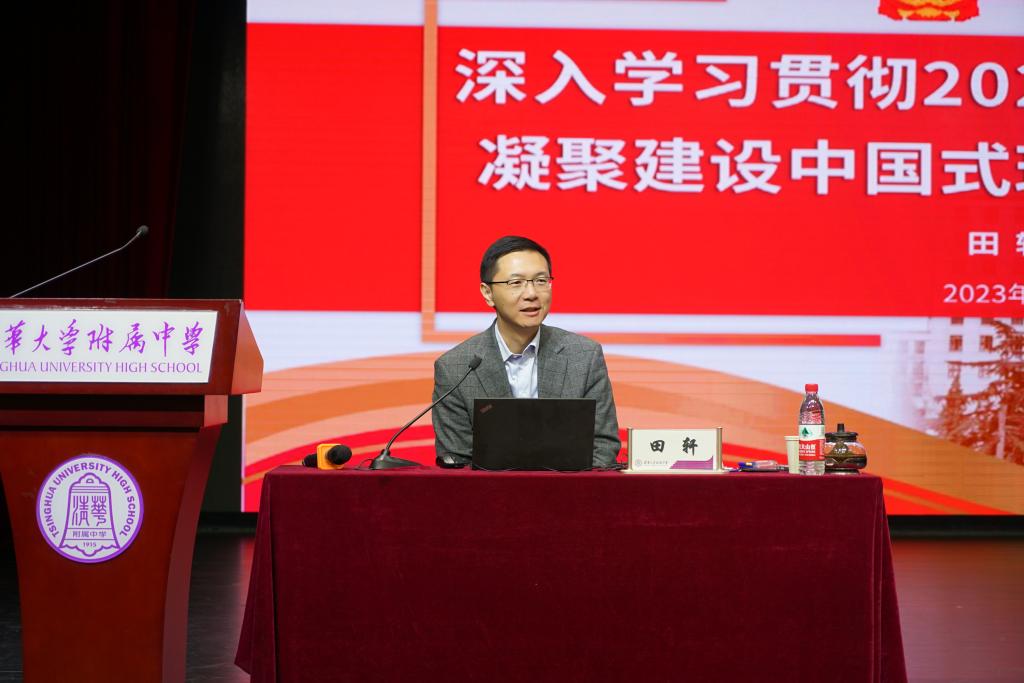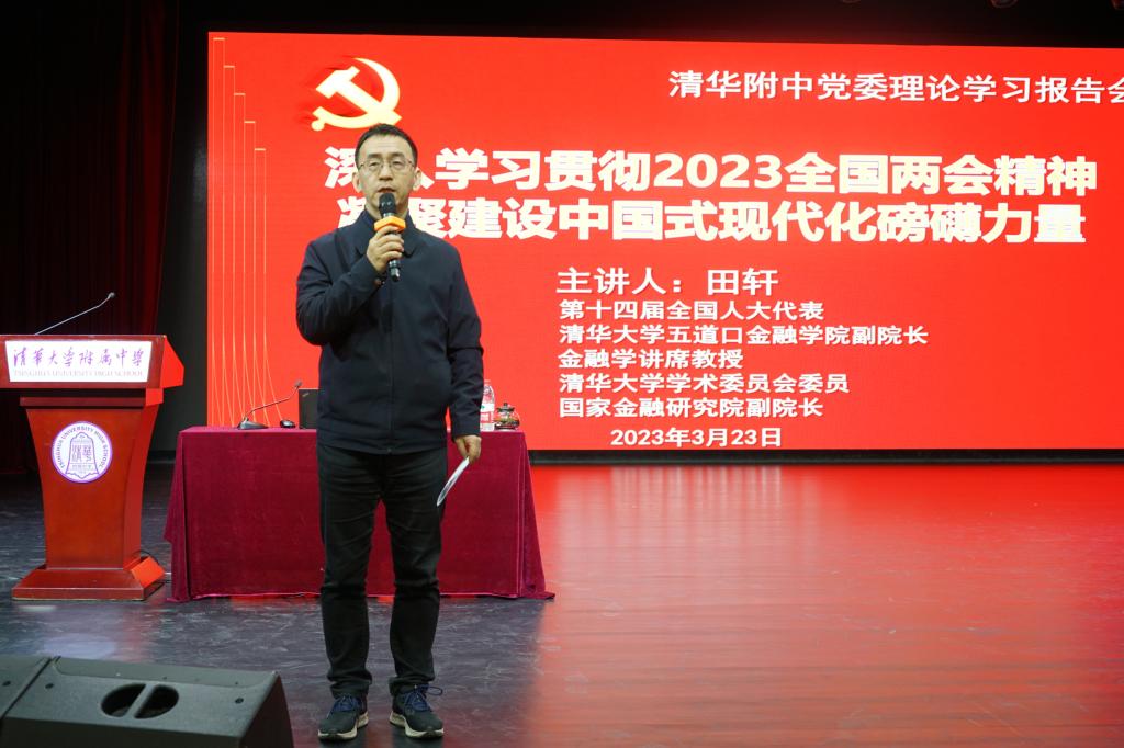 3月23日下午,bg真人试玩党委组织全校教职工学习2023年全国两会精神。第十四届全国人大代表、清华大学五道口金融学院副院长田轩受邀作题为《深入学习贯彻2023全国两会精神,凝聚建设中国式现代化磅礴力量》的专题报告。报告会由bg真人试玩党委书记曹海翔主持,学校全体教职工及业余党校学生共四百余人参加学习。