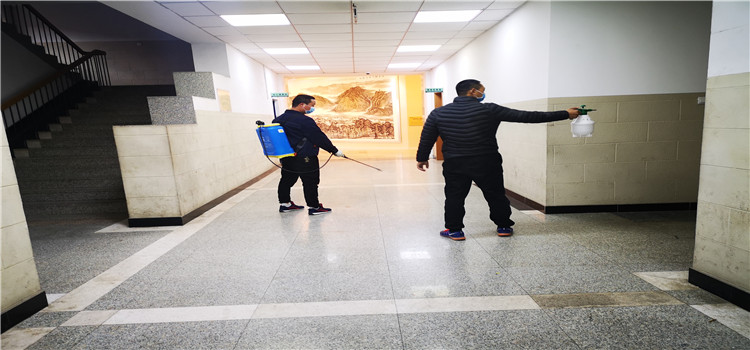 石坤龙老师、总务工人在教学区进行日常消毒