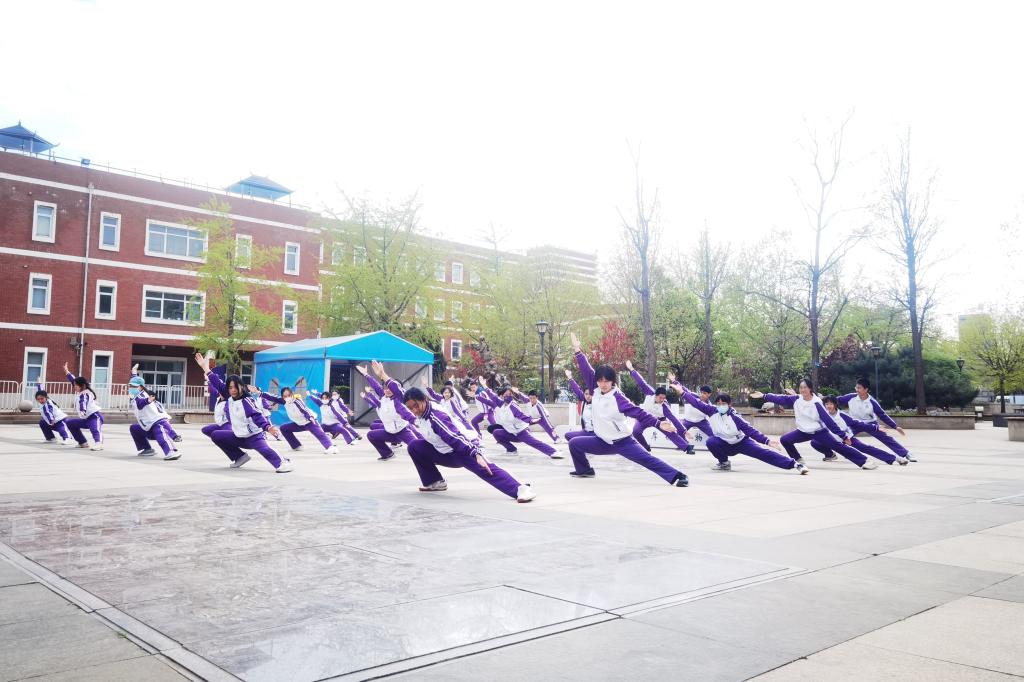 2023年4月6日,高二年级全体同学在银杏林前的下沉广场上参加了一场展现青春风采的“武林大会”,他们伴着音乐,打起形神拳,为校园带来了青春的气息。高二年级的全体教师也到场观赏表演,他们为同学们加油喝彩并投出自己心目中最佳的五个班级。高二10班的王彦鲁同学承担了解说的工作。