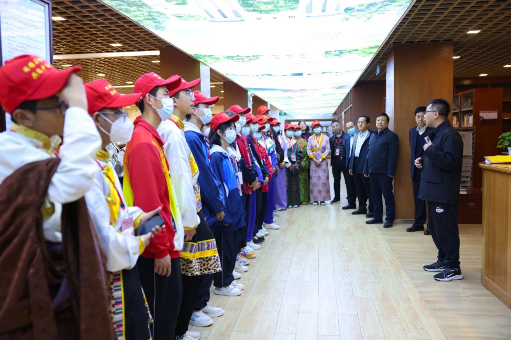 bg真人试玩图书馆馆长万军民(右一)为甘肃师生介绍bg真人试玩图书馆情况