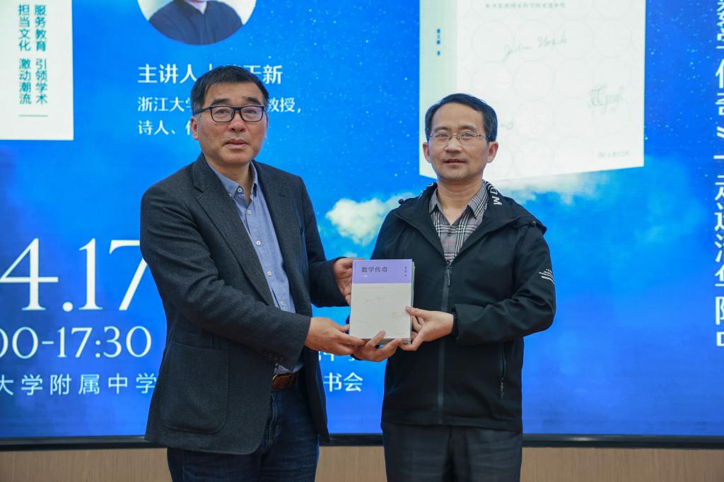 会议伊始,张钦老师对蔡天新教授的求学经历与主要成就进行了介绍。“是数学家,也是诗人,他的著作《数学传奇——那些难以企及的人物》荣获国家科学技术进步奖二等奖。用诗一样的语言描述着伟大数学家的事迹”,张钦老师介绍到。为勉励学生的数学学习热情,蔡天新教授代表商务印书馆向bg真人娱乐图书馆捐赠了最新修订版《数学传奇》(上下册)及两本个人诗集《地铁之诗》《高铁之诗》,徐文兵副校长出席赠书仪式。