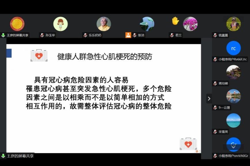 5月10日晚,bg真人试玩邀请北京市红十字会急诊抢救中心大夫王彦为离退休教职工带来线上健康讲座《心梗、脑梗的预防》。这是继4月12日《从饮食营养入手,提高老年人免疫力》主题健康讲座后,附中举办的第二次线上健康讲座。参与此次讲座的离退休教师共有三十余人。党委副书记兼离退休领导小组组长张洁主持讲座。