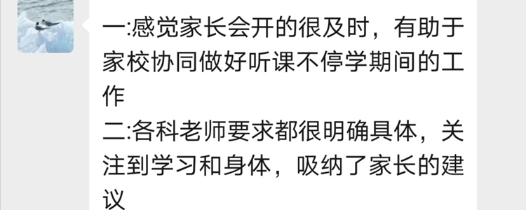 此次家长会的召开,意在指导学生在延期开学期间科学、有效居家学习,合理安排居家生活,锻炼基本生活技能,增强自主学习、自我规划意识和能力,促进学生健康成长和全面发展。家长们被课程设计的广度与温度和老师们的师德与才情深深感动,表示收获颇丰,定会协助孩子安排好疫情期间的学习和生活,让这段不一样的时期变得更有意义。