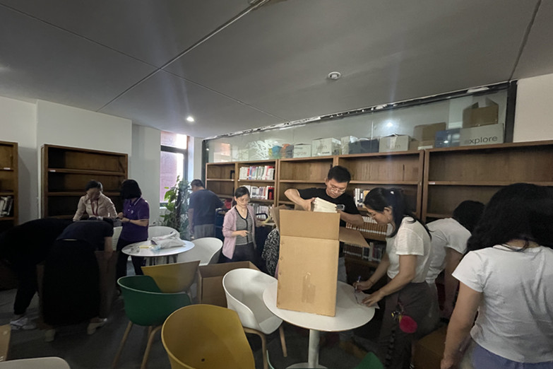 教育职员与国际部党支部参观国际部,交流管理经验,并到国际部图书馆开展志愿服务,协助图书整理打包工作。