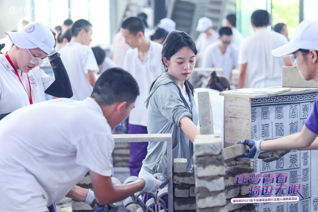 研学第一天,同学们首先赴黄山“润一·锐蓝”实践教育基地开展徽州照壁砌筑课程,锐蓝基地是世界技能大赛中国国家队的集训基地,在基地教练的讲解中,同学们了解了徽州照壁砌筑的特点和具体实操方法,并合作展开动手体验,在90分钟内完成徽州照壁模型的砌筑工程。同学们放砖块,抹水泥,协同合作,一丝不苟。在砖瓦交错间,同学们感受到了“大国工匠”精神的魅力所在,他们以“匠心”筑就了一个个中国智造,用“工匠精神”丰盈中华传统。