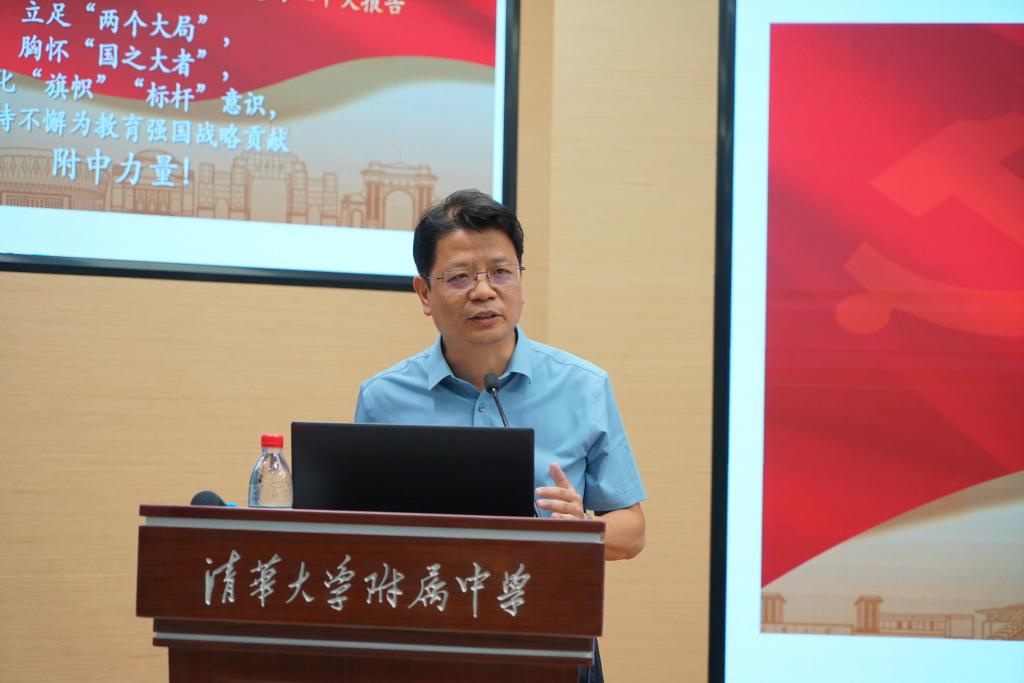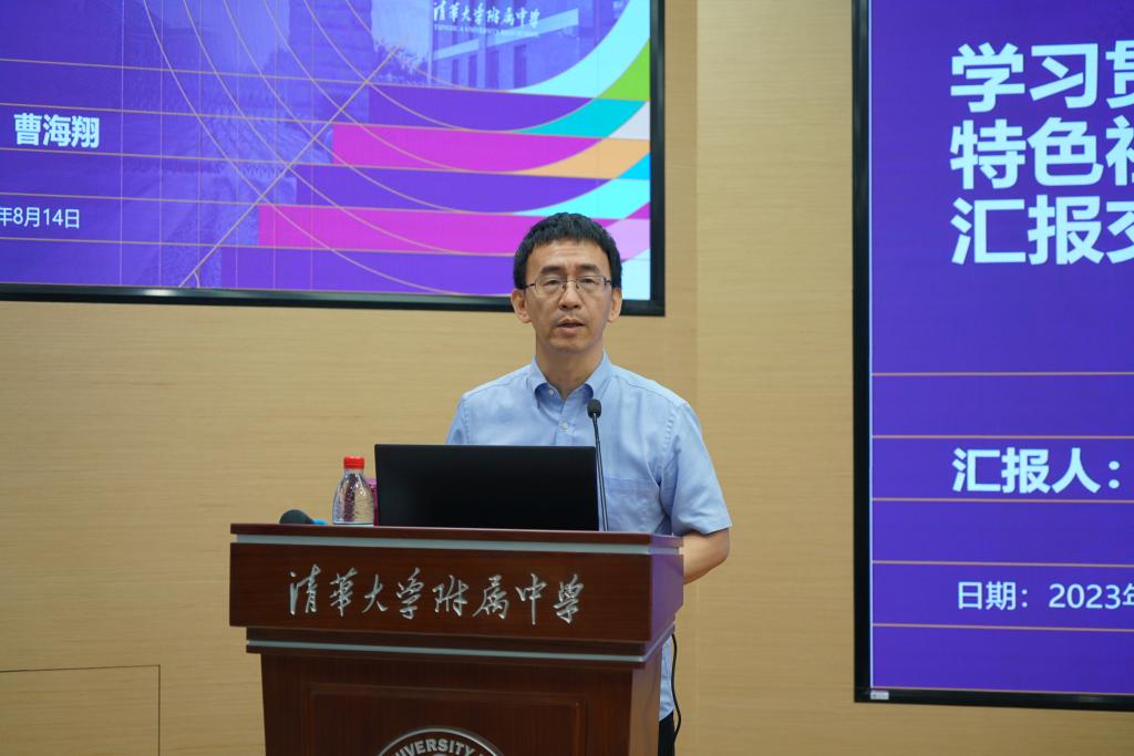 8月14日,根据清华大学党委统一部署,bg真人娱乐党委召开学习贯彻习近平新时代中国特色社会主义思想主题教育汇报交流会。bg真人娱乐校长方妍主持会议,党委书记曹海翔做专题汇报,清华大学党建联系指导组成员、校纪委委员、社科学院党委书记欧阳沁出席,附中党政班子成员、中层干部、党支部书记、教代会代表、党员群众代表及民主党派代表约60余人参加会议。