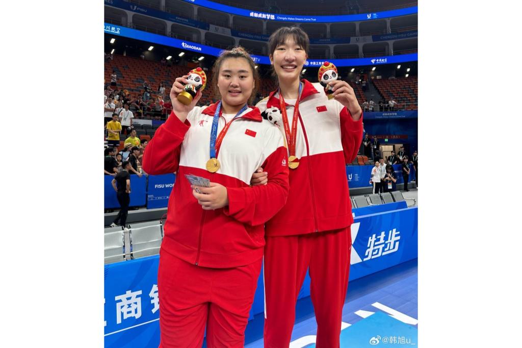 女篮队员韩旭和刘禹彤在决赛对阵日本队的比赛中也是多次在球队危机时刻挺身而出,每球必争。作为球队的内线核心,她们用自己的身躯扛起了中国女篮内线的一片天,也将五星红旗升起在了成都湛蓝的天空下。