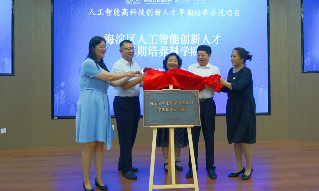 “海淀区人工智能创新人才早期培养科学院”揭牌(左起:贾珈、张宪国、吴颖惠、杜荣贞、方妍)