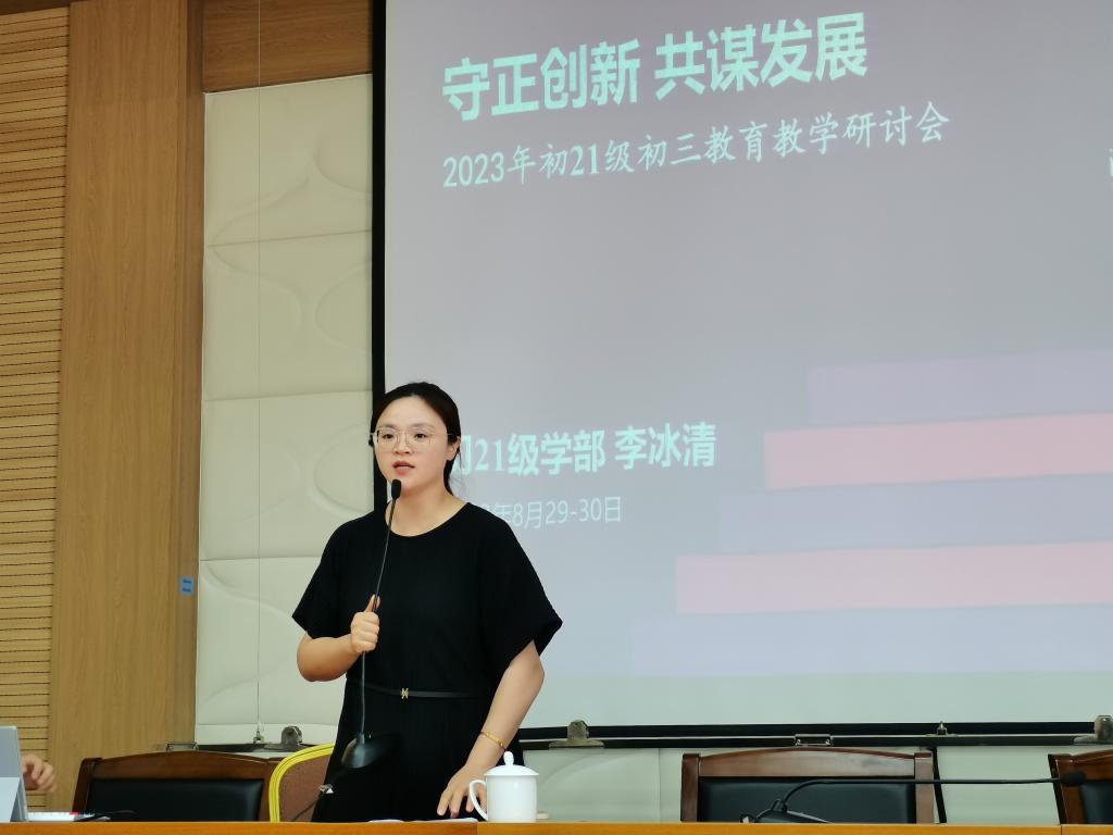 初21级学部主任李冰清对初21级的教育教学研讨部分总结发言。她分析初21级在不同层面上的诸多形势,强调“变”的是时代机遇,“不变”的是教育初心。在入境教育上,她指明了备课组、班级工作组和学生家长入境的各项事务,并总结了目前已经开展的工作,对初21级学部的工作要求进一步明确和细化。