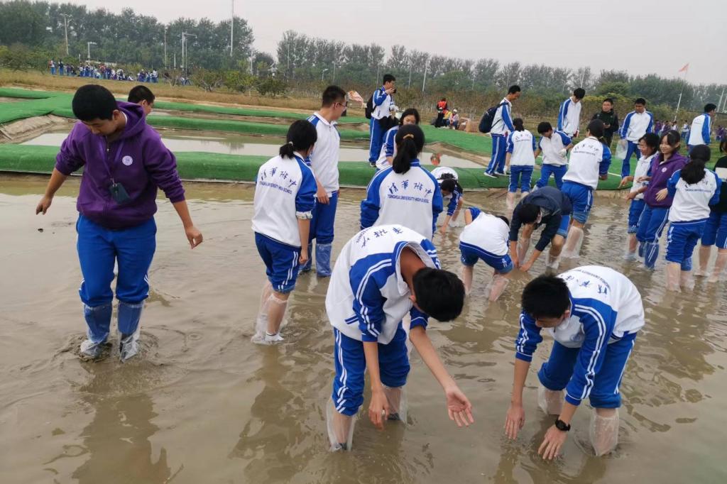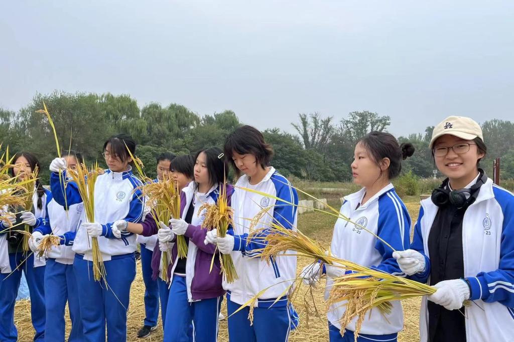 在金黄的稻田,同学们迈向黄土地,手持镰刀,在割下一束束稻穗的同时,也感受着集体劳动的快乐和丰收的喜悦。