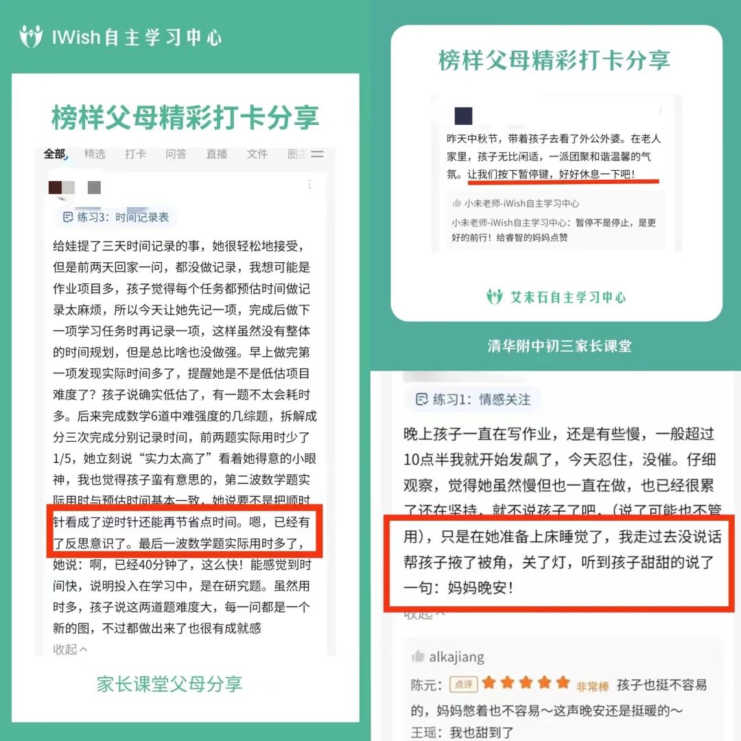 王瑶教授针对家长们的问题,进行线上个性化答疑(左),家长们每日坚持打卡记录亲子沟通(右)