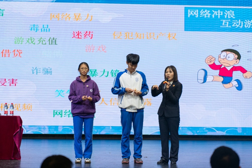 张林泉检察官通过对民法典的介绍,引导同学们分析维护自身权益的法律依据。她以游戏充值和直播打赏的案例为同学们讲解完全民事行为能力人、无民事行为能力人和限制民事行为能力人的区别,以及“谁主张谁举证”的举证规则,提醒大家网络消费需要理性谨慎。