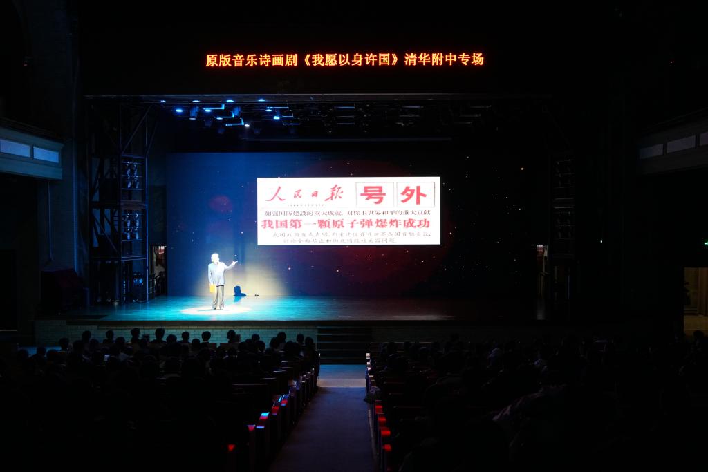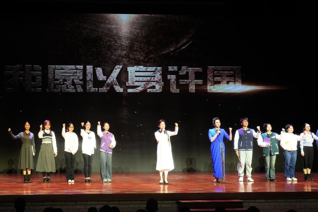 《我愿以身许国》讲述了中华民族在科技领域崛起的史诗故事,一幕幕颂歌荡气回肠,一场场画面让人激情澎湃。听着一行行滚烫的诗句,在场的老师和同学们都深深感受到中国科学家用爱国情怀铸就的科学辉煌,体会到他们对国家的无比忠诚和深沉热爱。整部音乐诗画剧共分为六场。