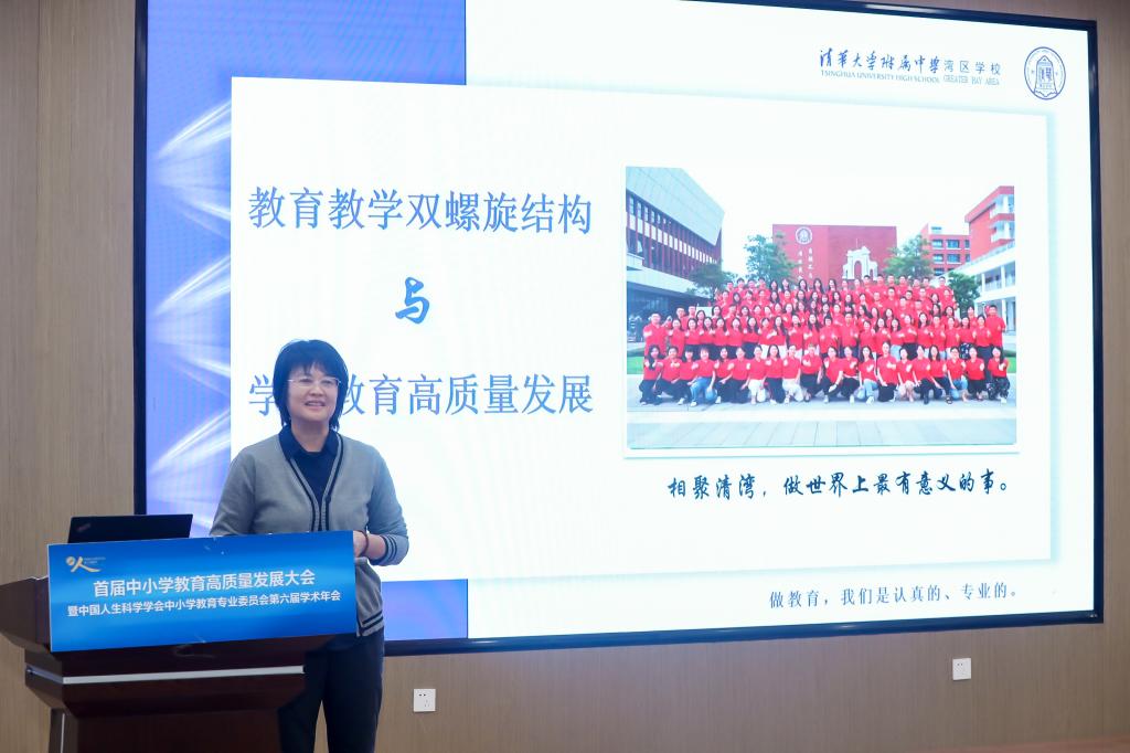 bg真人试玩湾区学校执行校长程惠云,以“教育教学双螺旋机制保障学校教育高质量发展”为题就学校在教育教学方面取得的成绩和与会者进行分享。
