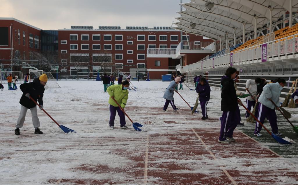 操场积雪逐渐被清扫干净