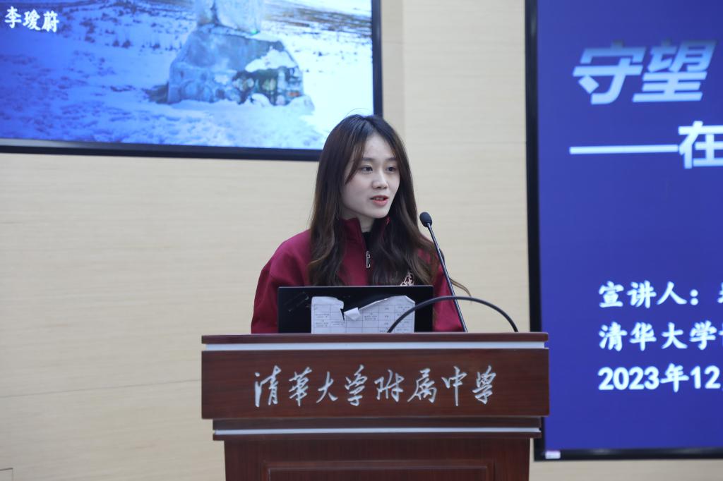 第二位进行宣讲的是清华大学博士生讲师团讲师,来自地球系统科学系的李瑷蔚学姐。她的宣讲题目是《守望“云端”证初心——在瓦里关大气本底站为地球“测体温”》。 首先,李瑷蔚讲师向同学们介绍了瓦里关大气本底基准观象台。科研工作者常年驻守荒原,克服高原严寒,忍受孤独寂寞,用30年积累的海量数据绘就业界闻名的“瓦里关曲线”。随后,李瑷蔚讲师向同学们介绍了要在自然条件如此恶劣、生活条件艰苦的地方选址成立气象观测站的原因。李瑷蔚讲师讲道,从蹒跚起步到国际知名,30年间,瓦里关本底台的观测技术、设备仪器、基础设施逐步完善精确。如今的中国已经走向世界,在应对气候变化行动中,中国从参与者、贡献者,逐步成为引领者,向世界贡献了更多的中国智慧,展现大国担当。三十年执着坚守,三十年守护净土,三十年科技赋能,站在瓦里关山顶望去,本底站80多米高的梯度观测塔巍然耸立,仿佛一架云梯直接天宇。它默默守望着脚下这片土地,记录着大气变化的点点滴滴,见证了一代代瓦里关气象人的坚守与奉献,更见证了中国气象科技事业的生生不息。