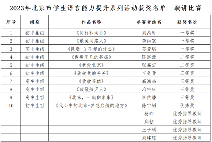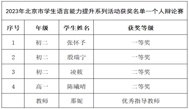 为提高学生的思维品质、语言素养和语言能力,拓宽学生的视野,积累赛事经验,不断深入弘扬中华优秀语言文化,推进文化自信自强,彰显时代精神,为实现中华民族伟大复兴凝聚磅礴力量,北京市教委、语委办举办北京市中小学生演讲比赛和辩论赛。bg真人试玩各年级学生积极参与、认真准备,在比赛中喜获佳绩,其中刘禹时、李雨宸、苏若琪、张怀予、殷瑞宁五位同学荣获一等奖,陈溪源、张嘉宏、凌筱、陈曦晴四位同学荣获二等奖,李美青、高鸿鸣、冶宇轩、李依璠四位同学荣获三等奖,陈宇韬同学荣获优秀奖,bg真人试玩教师杨玲、郑铉、王子嫣、刘建钰、那妮五位教师荣获优秀指导教师奖。