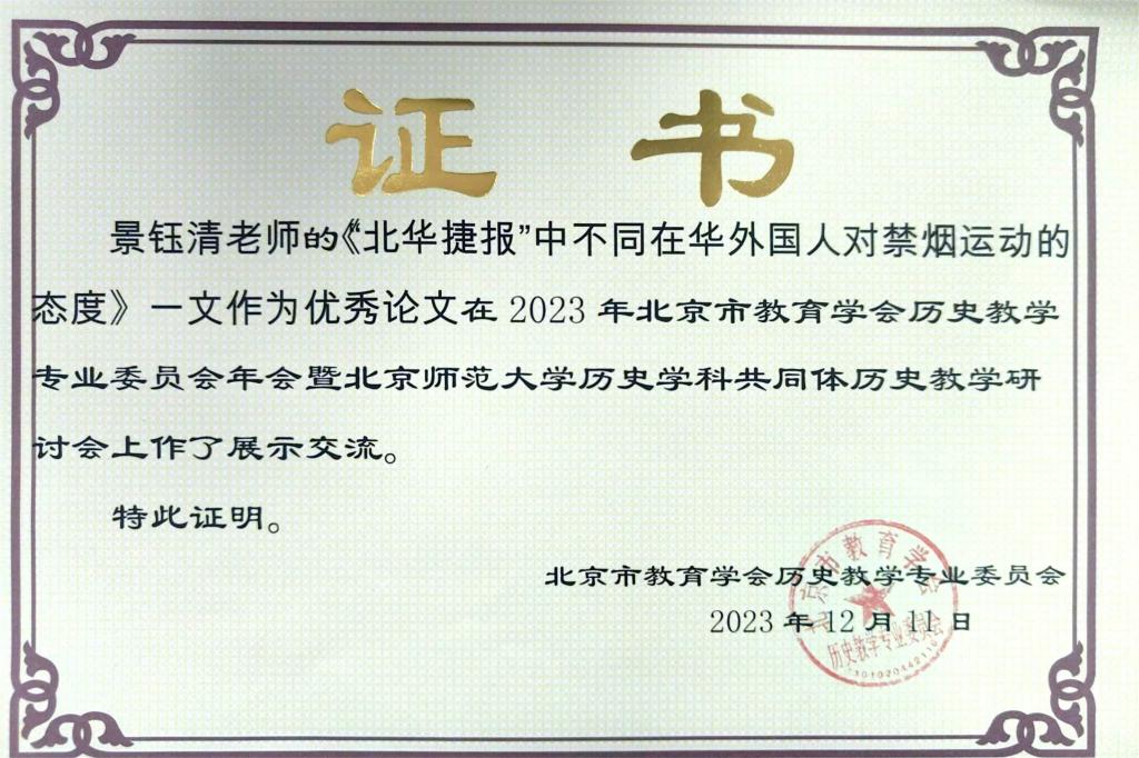 除了著作出版和课题立项外,历史教研组教师在论文获奖和发表方面也成果颇丰。宋薇老师的论文《中学历史教学与校外教育资源整合开发的现状及对策研究——以北京市海淀区中学为例》、景钰清老师的论文《“北华捷报”中不同在华外国人对禁烟运动的态度》作为优秀论文在北京市教育学会历史教学专业委员会年会暨北京师范大学历史学科共同体历史教学研讨会上作了展示交流。