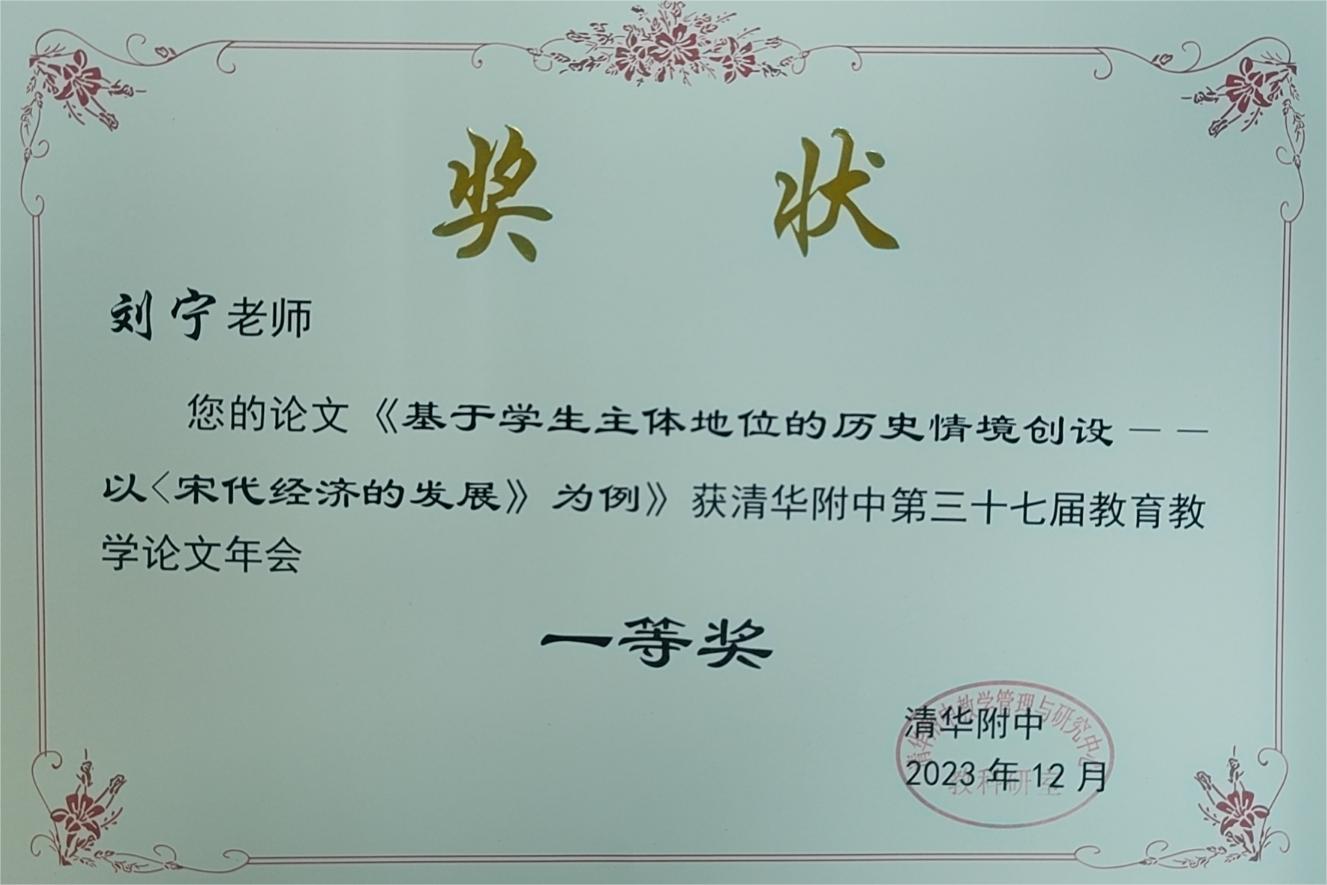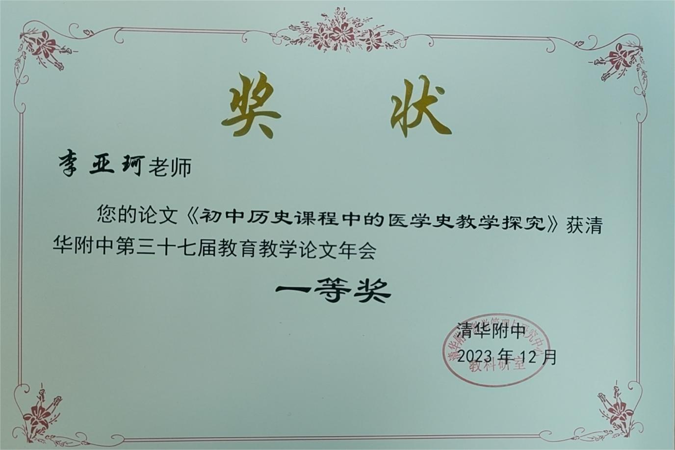 刘宁老师的论文《基于学生主体地位的历史情境创设——以〈宋代经济的发展〉为例》和李亚珂老师的论文《初中历史课程中的医学史教学探究》荣获bg真人娱乐第37届教育教学论文年会一等奖。