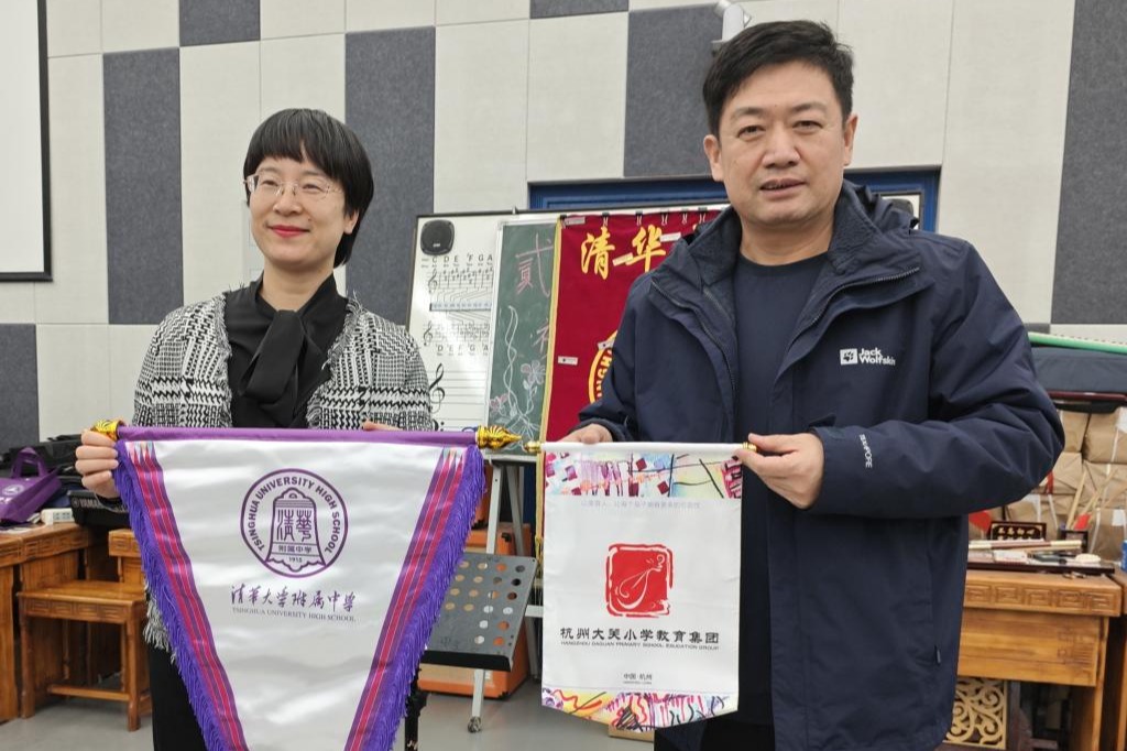 bg真人试玩主管德育的白雪峰副校长与杭州大关小学教育集团副总校长、杭州市大官小学校长孙慧敏女士交换校旗