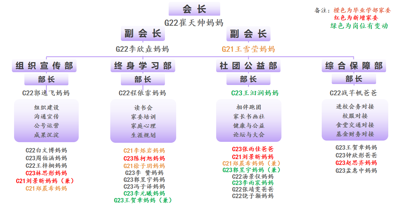 随后,会议全票通过了校家委会会长崔天帅妈妈的提议,由王汩润妈妈接替副会长王雪莹妈妈兼任的社团公益部部长一职。崔天帅妈妈介绍了因工作需要补录进本届校家委会的新成员情况,并指出未来半年将继续在工作中打造团队、培养梯队,推动校家委会持续健康发展。
