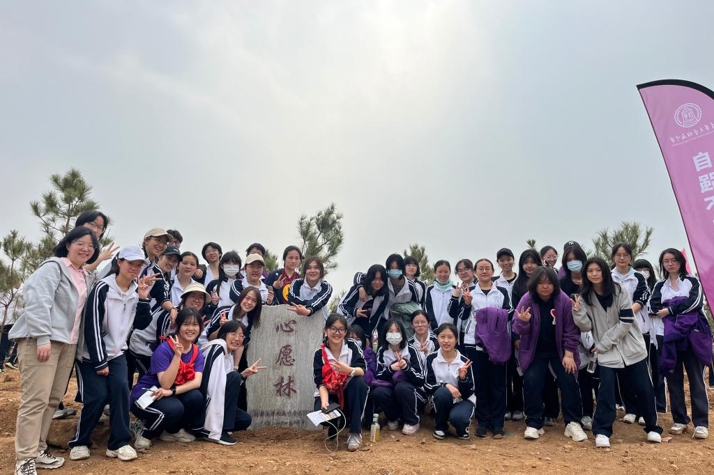 登上高峰,同学们欣赏雾气氤氲的山间美景,也眺望自己刚刚种下的树林、许下的心愿。此时青松正劲,无悔青春;来日星河滚烫,不负韶华。