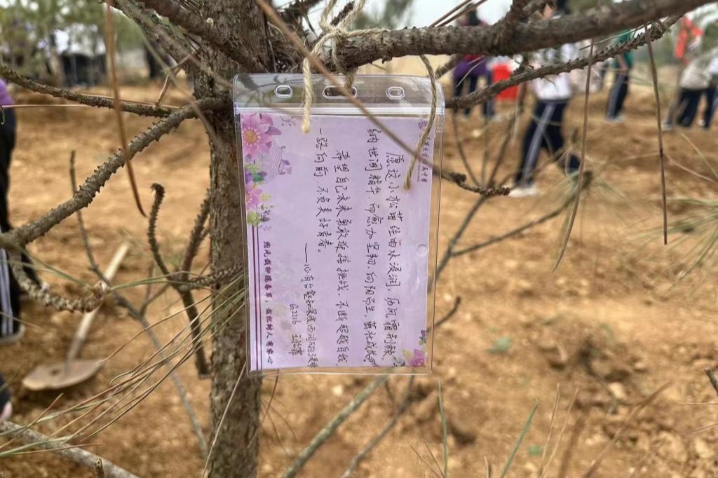 完成栽种过程后,同学们一字一句的心愿与期盼被书写在寄语卡上,这些美好的心愿将随着深绿纤细的油松树苗一同茁壮成长。