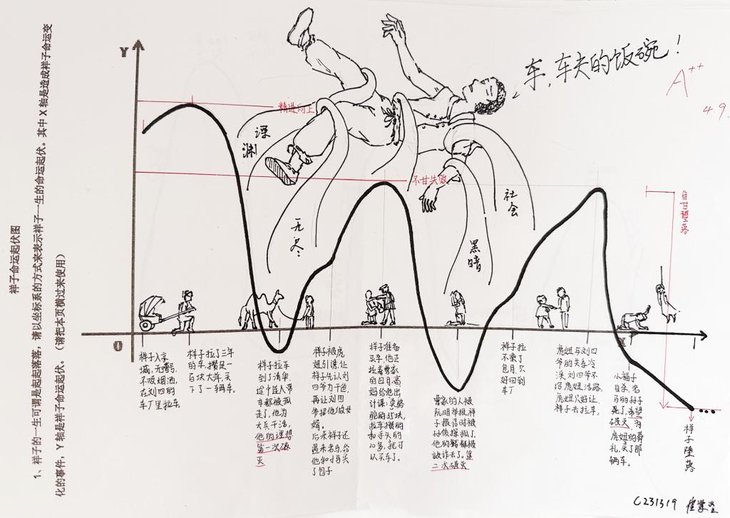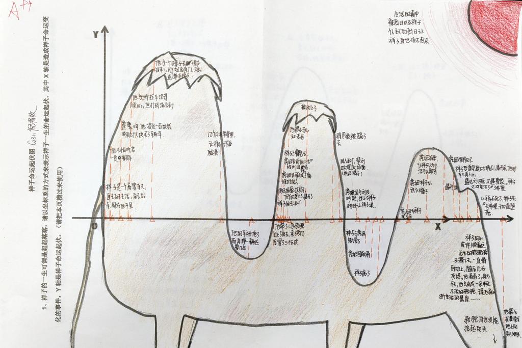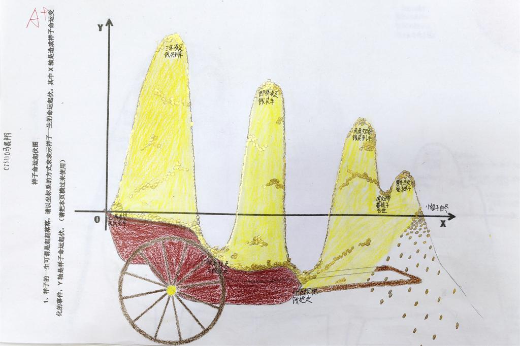 初一学部在读书季活动中,由语文备课组牵头开展《骆驼祥子》名著阅读趣味活动。为了激发同学们的阅读研究兴趣,初一学部语文老师们设计了相关趣味活动,比如围绕其他人物与祥子的关系,引导学生做一系列特色比喻;再比如围绕祥子起起落落的人生,请同学们以坐标系的方式标示祥子一生的命运起伏……这些构思新颖的名著阅读小活动,就像“祥子牵走三匹骆驼”一样,牵出了众多读书精品成果。