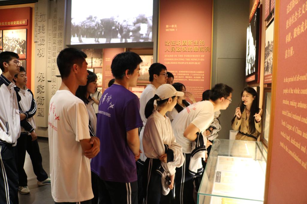 同学们首先观看了中国青年在党的领导下挥洒青春、接续奋斗的宣传短片。跟随讲解员的脚步,同学们进入展馆,回到了1922年5月5日中国共青团成立的时刻(时称中国社会主义青年团),了解第一批入团青年学习工作、为共产主义事业奋斗的过程。该展馆以“中国青年在党的领导下为实现中华民族伟大复兴而不懈奋斗”为主题,分“紧跟党打破旧世界”“追随党建设新中国”“听党号召搏击改革潮”“青春向党奋进新时代”四个部分,直观地展现了党领导的中国青年运动百年历程中的重要人物、事件、会议和活动,生动地反映了一代代青年紧跟着党、为实现民族复兴不懈奋斗的壮阔征程。从青年陈望道翻译《共产党宣言》时发出“真理的味道是甜的”的感叹,到毛主席回韶山为少年“牵红线”的故事,再到举办全国大学生科技学术竞赛“挑战杯”的新闻,中国先进青年在百年间的青春风采与光辉成绩徐徐展开,吸引同学们不时驻足观看,与讲解员互动交流,像穿越时空一般沿时间线走过团的历史,感悟一代代青年的责任与使命。