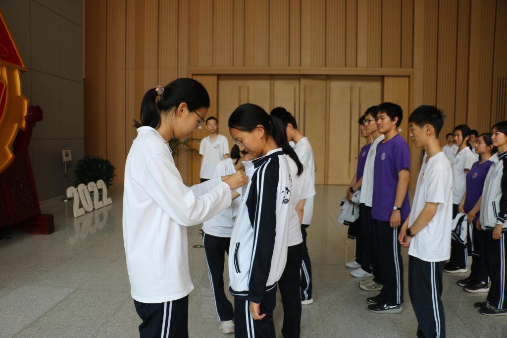 参观结束后,团支部举行了入团宣誓活动。三位新团员的入团介绍人为他们佩戴了团徽,随后,18名团员在团支书刘晨旭的带领下,面向庄严的团徽,高举右拳,庄严宣誓,宣誓声激荡回响在展馆大厅。团员的培养与成长,体现了中国共青团生生不息、发展壮大的历史,也是团向未来进发、做中国共产党的助手和后备军、建设社会主义现代化强国的基础。