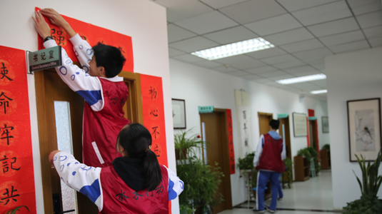 “贴春联、迎新年”是中华民族的传统习俗。在辞旧迎新之际,bg真人试玩初二(11)班作为本周水木行动的班级,积极参与张贴春联的活动。他们将饱含附中学子美好祝愿的春联张贴至成志楼、教学楼及班级门前。翰墨飘香的春联,为bg真人试玩带来了一派喜庆吉祥。