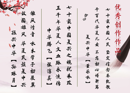 诗以言志,“雏凤清音 水木学子初展翼,故国雄风 华夏民族复中兴”、“七十载中国人民 坚定信念奏凯歌,千百代华夏儿女 不忘初心谱新篇”、“提笔绘五千年伟业 无限江山 半卷浩浩,捻指奏七十载宏图 秦王破阵 一曲铮铮”一幅幅包含深情的创作承载着附中学子对新时代的祝福、对志向的追求以及对祖国的赤子情怀。