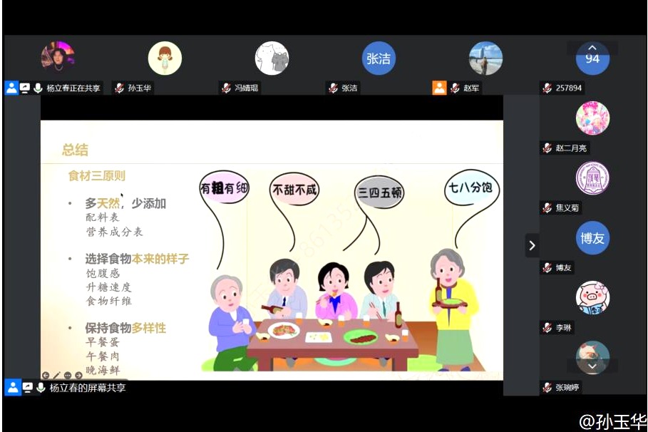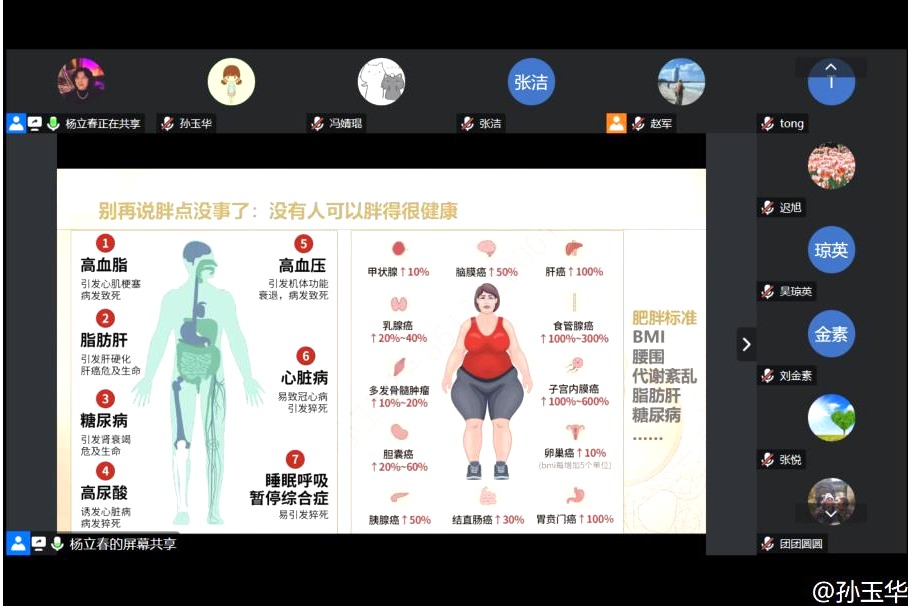 5月17日晚,bg真人娱乐工会邀请杨立春大夫为本部及将台路校区教职工及家属们做“科学减脂找回久违的轻盈感”的直播讲座。党委副书记兼工会主席张洁老师带领60多位教职工和部分家属线上聆听讲座。