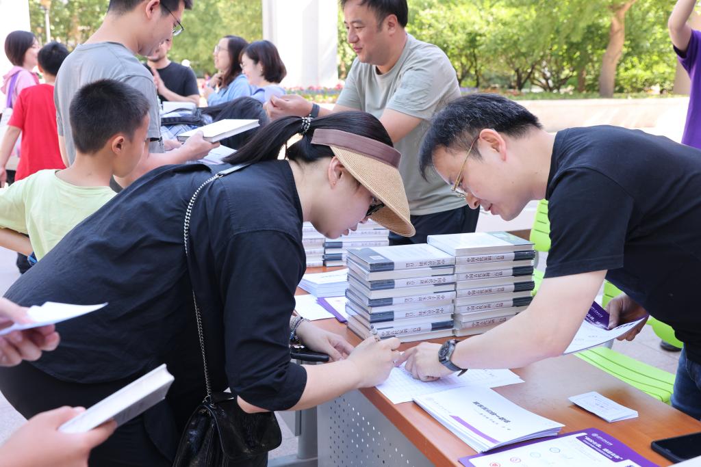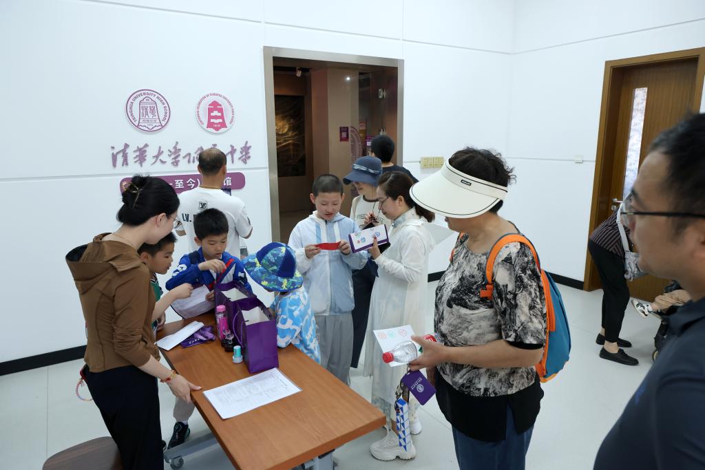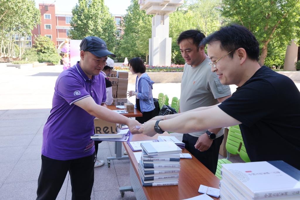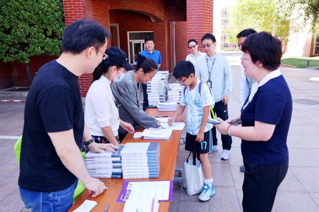 成志楼门口签到处,教职工及家属有序签到,领取校长方妍“致家属的一封信”《你们是我们最在意的人》、方校长赠书《中国古代家训三百篇》、活动打卡单、儿童的六一礼物等。过程中,校领导热情地与家属问候寒暄,赠送礼物,合影留念,犹如一家人,其乐融融。